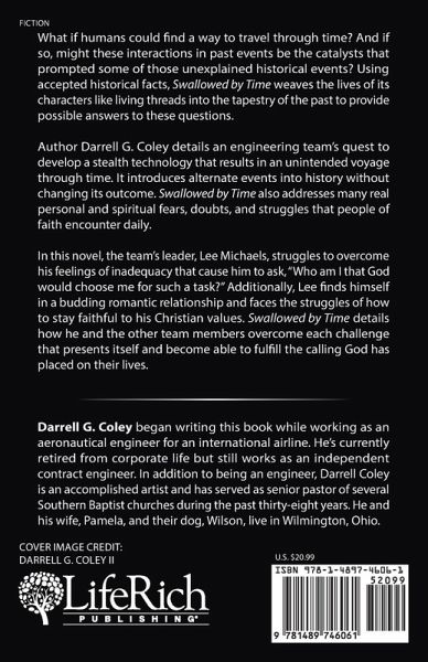 What if humans could find a way to travel through time? And if so, might these interactions in past events be the catalysts that prompted some of those unexplained historical events? Using accepted historical facts, Swallowed by Time weaves the lives of its characters like living threads into the tapestry of the past to provide possible answers to these questions. Author Darrell G. Coley details an engineering team's quest to develop a stealth technology that results in an unintended voyage through time. It introduces alternate events into history without changing its outcome. Swallowed by Time also addresses many real personal and spiritual fears, doubts, and struggles that people of faith encounter daily. In this novel, the team's leader, Lee Michaels, struggles to overcome his feelings of inadequacy that cause him to ask, "Who am I that God would choose me for such a task?" Additionally, Lee finds himself in a budding romantic relationship and faces the struggles of how to stay faithful to his Christian values. Swallowed by Time details how he and the other team members overcome each challenge that presents itself and become able to fulfill the calling God has placed on their lives.