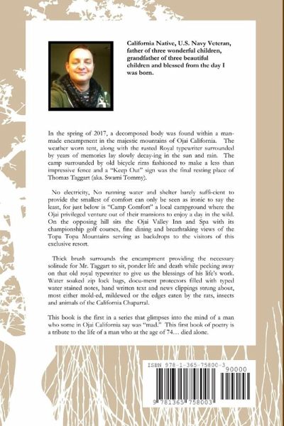In the spring of 2017, a decomposed body was found within a man-made encampment in the majestic mountains of Ojai California. The weather worn tent, along with the rusted Royal typewriter surrounded by years of memories lay slowly decaying in the sun and rain. The camp surrounded by old bicycle rims fashioned to make a less than impressive fence and a "Keep Out" sign was the final resting place of Thomas Taggart (aka. Swami Tommy).