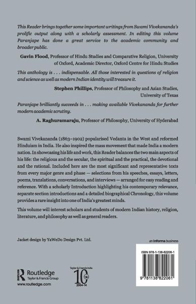 Swami Vivekananda (1863-1902) popularised Vedanta in the West and reformed Hinduism in India. He also inspired the mass movement that made India a modern nation. In showcasing his life and work, this Reader balances the two main aspects of his life: the religious and the secular, the spiritual and the practical, the devotional and the rational. Included here are the most significant and representative texts from every major genre and phase - selections from his speeches, essays, letters, poems, translations, conversations, and interviews - arranged for easy reading and reference. With a scholarly Introduction highlighting his contemporary relevance, separate section introductions and a detailed biographical Chronology, this volume provides a rare insight into one of India's greatest minds. This volume will interest scholars and students of modern Indian history, religion, literature, and philosophy as well as general readers.