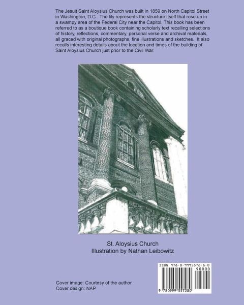 The Jesuit Saint Aloysius Church was built in 1859 on North Capitol Street in Washington, D.C. The lily represents the structure itself that rose up in a swampy area of the Federal City near the Capitol. This book has been referred to as a boutique book containing scholarly text recalling selections of history, reflections, commentary, personal verse and archival materials, all graced with original photographs, fine illustrations and sketches. It also recalls interesting details about the location and times of the building of Saint Aloysius Church just prior to the Civil War. As a key player in the planning and working committees of renovation of the Church, the author feels it necessary to continue the care and preservation of St. Aloysius in the future because of the cultural value it brings to the City, the Nation and the World. The book underlines the importance of the structure’s architect, Benedict Sestini, S.J., and Costantino Brumidi, the "Michelangelo" of the U.S. Captiol, who donated his fine oils on canvas to grace the interior. Their combined creativity and artistry made Saint Aloysius Church a landmark of great value in Washington. The Swampoodle Lily is planted and thrives on the campus of Gonzaga College High School.