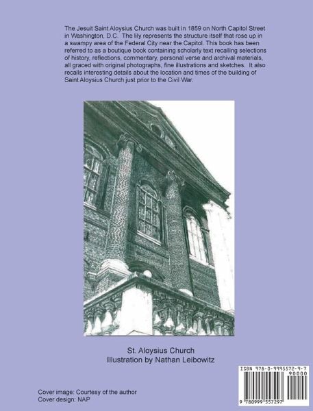 The Jesuit Saint Aloysius Church was built in 1859 on North Capitol Street in Washington, D.C. The lily represents the structure itself that rose up in a swampy area of the Federal City near the Capitol. This book has been referred to as a boutique book containing scholarly text recalling selections of history, reflections, commentary, personal verse and archival materials, all graced with original photographs, fine illustrations and sketches. It also recalls interesting details about the location and times of the building of Saint Aloysius Church just prior to the Civil War. As a key player in the planning and working committees of renovation of the Church, the author feels it necessary to continue the care and preservation of St. Aloysius in the future because of the cultural value it brings to the City, the Nation and the World. The book underlines the importance of the structure’s architect, Benedict Sestini, S.J., and Costantino Brumidi, the "Michelangelo" of the U.S. Captiol, who donated his fine oils on canvas to grace the interior. Their combined creativity and artistry made Saint Aloysius Church a landmark of great value in Washington. The Swampoodle Lily is planted and thrives on the campus of Gonzaga College High School.