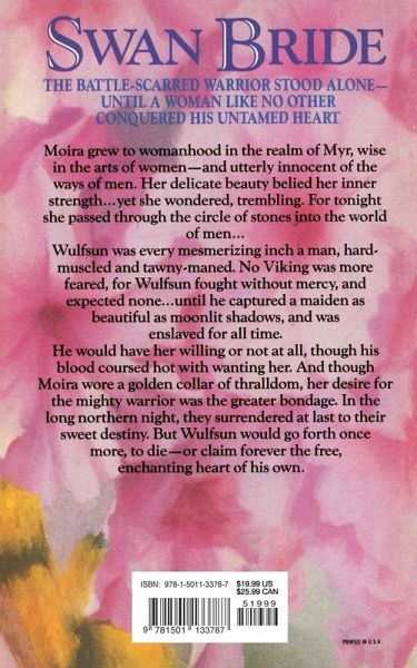 In the first book of the Swan Maiden trilogy, Wulfsun, a lonesome battle-scarred warrior, has his untamed heart conquered by a young, innocent woman new to the ways of men. Moira has grown to womanhood in the realm of Myr: a land wise in the arts of women, but utterly innocent to the ways of men. Though her delicate beauty belied her inner strength, she still wondered, trembling, what it would be like to feel the touch of a man. Passing into the circles of stones and into the world of men for one night came with a lot of surprises, but Moira never thought she’d find Wulfsun. Every mesmerizing inch a man, he was hard-muscled, tawny-maned, and always fought without mercy…until he captures a maiden as beautiful as moonlit shadows and becomes enslaved to her love for all time. His blood courses hot with wanting for Moira, but he will have her willing or not at all. One long northern night, they will surrender at last to their sweet destiny, but Wulfsun must go forth once more, to die—or to claim forever the free, enchanting heart of his own.