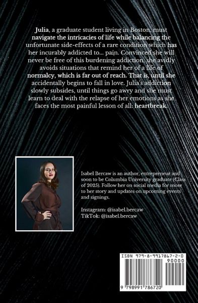 Julia, a graduate student living in Boston, must navigate the intricacies of life while balancing the unfortunate side-effects of a rare condition which has her incurably addicted to... pain. Convinced she will never be free of this burdening addiction, she avidly avoids situations that remind her of a life of normalcy, which is far out of reach. That is, until she accidentally begins to fall in love. Julia's addiction slowly subsides, until things go awry and she must learn to deal with the relapse of her emotions as she faces the most painful lesson of all: heartbreak.