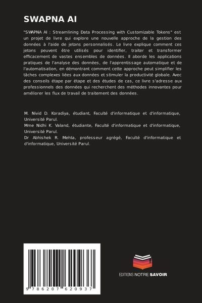 "SWAPNA AI : Streamlining Data Processing with Customizable Tokens" est un projet de livre qui explore une nouvelle approche de la gestion des données à l'aide de jetons personnalisés. Le livre explique comment ces jetons peuvent être utilisés pour identifier, traiter et transformer efficacement de vastes ensembles de données. Il aborde les applications pratiques de l'analyse des données, de l'apprentissage automatique et de l'automatisation, en démontrant comment cette approche peut simplifier les tâches complexes liées aux données et stimuler la productivité globale. Avec des conseils étape par étape et des études de cas, ce livre s'adresse aux professionnels des données qui recherchent des méthodes innovantes pour améliorer les flux de travail de traitement des données.