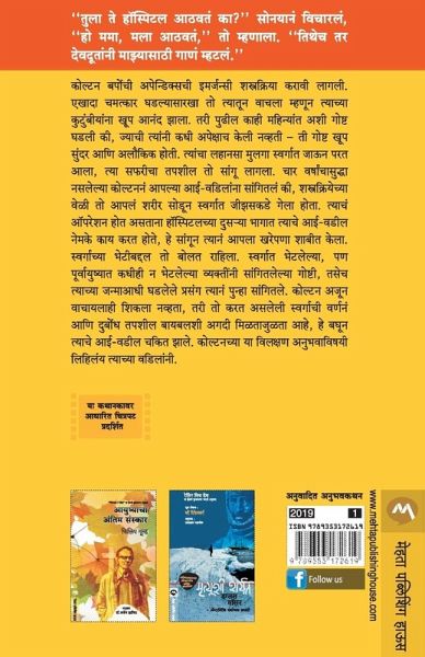 "DO YOU REMEMBER THE HOSPITAL, COLTON?" SONJA SAID. "YES, MOMMY, I REMEMBER," HE SAID. "THAT'S WHERE THE ANGELS SANG TO ME." WHEN COLTON BURPO MADE IT THROUGH AN EMERGENCY APPENDECTOMY, HIS FAMILY WAS OVERJOYED AT HIS MIRACULOUS SURVIVAL. WHAT THEY WEREN'T EXPECTING, THOUGH, WAS THE STORY THAT EMERGED IN THE MONTHS THAT FOLLOWED-A STORY AS BEAUTIFUL AS IT WAS EXTRAORDINARY, DETAILING THEIR LITTLE BOY'S TRIP TO HEAVEN AND BACK. COLTON, NOT YET FOUR YEARS OLD, TOLD HIS PARENTS HE LEFT HIS BODY DURING THE SURGERY-AND AUTHENTICATED THAT CLAIM BY DESCRIBING EXACTLY WHAT HIS PARENTS WERE DOING IN ANOTHER PART OF THE HOSPITAL WHILE HE WAS BEING OPERATED ON. HE TALKED OF VISITING HEAVEN AND RELAYED STORIES TOLD TO HIM BY PEOPLE HE MET THERE WHOM HE HAD NEVER MET IN LIFE, SHARING EVENTS THAT HAPPENED EVEN BEFORE HE WAS BORN. HE ALSO ASTONISHED HIS PARENTS WITH DESCRIPTIONS AND OBSCURE DETAILS ABOUT HEAVEN THAT MATCHED THE BIBLE EXACTLY, THOUGH HE HAD NOT YET LEARNED TO READ. WITH DISARMING INNOCENCE AND THE PLAINSPOKEN BOLDNESS OF A CHILD, COLTON TELLS OF MEETING LONG-DEPARTED FAMILY MEMBERS. HE DESCRIBES JESUS, THE ANGELS, HOW "REALLY, REALLY BIG" GOD IS, AND HOW MUCH GOD LOVES US. RETOLD BY HIS FATHER, BUT USING COLTON'S UNIQUELY SIMPLE WORDS, HEAVEN IS FOR REAL OFFERS A GLIMPSE OF THE WORLD THAT AWAITS US, WHERE AS COLTON SAYS, "NOBODY IS OLD AND NOBODY WEARS GLASSES." HEAVEN IS FOR REAL WILL FOREVER CHANGE THE WAY YOU THINK OF ETERNITY, OFFERING THE CHANCE TO SEE, AND BELIEVE, LIKE A CHILD. टॉड बर्पो हे नेब्रास्कातील इम्पीरिअल या गावी क्रॉसरोड्स वेस्लेयान चर्चचे धर्मोपदेशक आहेत. ते चेस काउन्टी पब्लिक स्कूलमध्ये कुस्तीचे मार्गदर्शक व आणीबाणीच्या प्रसंगी इम्पीरिअल व्हॉलेंटियर फायर डिपार्टमेंटच्या जवानांबरोबर स्वयंसेवक म्हणूनही आगीशी झुंजतात. कुटुंबाला आर्थिक आधार देण्यासाठी टॉड ओव्हरहेड डोअर स्पेशालिस्ट ही कंपनीही चालवतात. त्यांची पत्नी सोनया ही अर्ध वेळ शिक्षिका असून, त्यांना कॅसी ही मुल