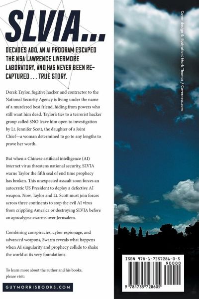 Swarm is an action-packed thriller with advanced artificial intelligence weapons set in a divided, post-pandemic country struggling to maintain social and national security. China has unleashed a devastating AI internet virus forcing antihero hacker Derek Taylor into a deadly conspiracy of digital identity control and end-time prophecy. When an AI weapon system goes rogue, only a fugitive AI called SLVIA with a terrorist hacker group known only as SNO can prevent Armageddon. Exploring the morality of artificial intelligence weapons while navigating church and political corruption, debut author Guy Morris's sharp and frighteningly realistic storytelling will leave readers questioning what their future holds in this ambitious, edge-of-your-seat cyberthriller. SWARM and author Guy Morris were featured in November 2020 by Master Class as one of nine aspiring authors to watch. What reviewers say about Swarm. "A Pulse-pounding, grab you by the throat, thrill ride! Author Guy Morris is a master of intrigue, tension and in control of his craft, transporting you into an immersive world of Artificial Intelligence, political corruption and intense military maneuvering. The "must read" book of the year." Jack Teetor, film producer. "This is a whirlwind, action packed thriller! The perfect read for those who enjoy spy thrillers, action and adventure thrillers and anything involving AI and the morals of developing artificial intelligence. As a fan of the genre, it was easy to get wrapped up in the dramatic world the author crafted. The book created the same heart-pounding and depth-filled reading experience of films like the Bourne Identity." Tony Espinoza, Pacific Book Review. ¿ "Author Guy Morris has crafted a superb tale of advanced weaponry, espionage and conspiracy which fans of the action and thriller genres are sure to adore. Overall, I would certainly recommend Swarm for fans of conspiracy dramas at their very best." K.C. Finn Reader's Favorite. "Swarm is a deftly plotted and brilliantly written thriller that will entice fans of conspiracy and espionage. . . Guy Morris has written a novel that is gripping and intense when it comes to the action and plot points. The vocabulary is rich and the imagery is exceptionally written. Swarm: Artificial Intelligence Decodes End Time Prophecies is cleverly plotted, gripping, featuring characters that are rock-solid and a conspiracy that feels real." Romuald Dzemo with Reader's Favorite. "Swarm is absolutely brilliant. Guy has written a thriller I could not out down. I am a huge Dan Brown fan and I feel that Guy is right there with him. If you loved the Da Vinci Code then Swarm is right up your alley." Derek Thomas, business owner.