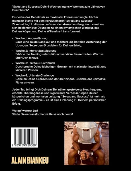 "Sweat and Success: Dein 4-Wochen Intensiv-Workout zum ultimativen Durchbruch" Entdecke das Geheimnis zu maximaler Fitness und unglaublicher mentaler Stärke mit dem revolutionären "Sweat and Success" Zirkeltraining! In diesem umfassenden 4-Wochen-Programm vereinen sich hochintensive Übungen zu einem dynamischen Workout, das Deinen Körper und Deine Willenskraft transformiert. - Woche 1: Angewöhnung Baue eine solide Basis auf und meistere die korrekte Ausführung der Übungen. Setze den Grundstein für Deinen Erfolg. - Woche 2: Intensitätssteigerung Erhöhe die Trainingsintensität und verkürze Pausenzeiten. Wachse über Dich hinaus. - Woche 3: Plateau-Durchbruch Durchbreche Deine bisherigen Grenzen mit maximaler Intensität und kürzeren Pausen. - Woche 4: Ultimate Challenge Gehe an Deine Grenzen und darüber hinaus. Erreiche das ultimative Fitnessniveau. Jeder Tag bringt Dich Deinem Ziel näher: gesteigerte Herzfrequenz, erhöhte Thermogenese und signifikante Verbesserungen Deiner körperlichen und mentalen Leistung. "Sweat and Success" ist mehr als ein Trainingsprogramm - es ist eine Einladung zu Deinem persönlichen Erfolg. Worauf wartest Du? Starte Deine transformative Reise noch heute!