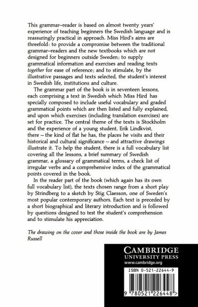 This grammar-reader is based on almost twenty years' experience of teaching beginners the Swedish language and is reassuringly practical in approach. Miss Hird's aims are threefold: to provide a compromise between the traditional grammar-readers and the new textbooks which are not designed for beginners outside Sweden; to supply grammatical information and exercises and reading texts together for ease of reference; and to stimulate the student's interest in Swedish life, institutions and culture. The grammar part of the book is in seventeen lessons, each comprising a text in Swedish which Miss Hird has specially composed to include useful vocabulary and graded grammatical points upon which exercises (including translation exercises) are set for practice. The central theme of the texts is Stockholm, and attractive drawings illustrate it. To help the student, there is a full vocabulary list covering all the lessons, a brief summary of Swedish grammar, a glossary of grammatical terms, a check list of irregular verbs and a comprehensive index of the grammatical points covered in the book. In the reader part of the book, the texts chosen range from a short play by Strindberg to a sketch by Stig Claesson, one of Sweden's most popular contemporary authors. Each text is preceded by a short biographical and literary introduction and is followed by questions designed to test the student's comprehension and to stimulate his appreciation.