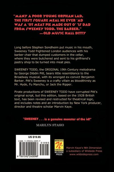 "[This] grisly melodrama stirs powerful feelings of revulsion and terror in a modern reader with imagination, and with an uneasy respect for evil. The labyrinthine cellars beneath Sweeney's shop are as twisted and murky as the psychological abyss from which spring all human nightmares, and Sweeney himself is a genuine monster of the id. No one who suspects that evil can take on human features could fail to tremble at his memorable line: 'I believe I am not easily forgotten by those who have once seen me.'" --Marilyn Stasio Variations on this play have been filmed and put on Broadway as a musical. This version, carefully restored by author and scholar Marvin Kaye, returns to the original text and clears away many of the problems created by lesser talents trying to revise the text. Footnotes and an afterword on staging a production of Sweeney Todd based on this text provide useful additional information.