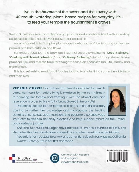 ¿Live in the balance of the sweet and the savory with 40 mouth-watering, plant-based recipes for everyday life... to feed your temple the nourishment it craves! Sweet & Savory Life is an enlightening, plant-based cookbook filled with incredibly delicious recipes to nourish your body, mind, and spirit! Yecenia's goal is to "amplify plant-based deliciousness" by focusing on recipes packed with both nutrition and flavor. Sprinkled throughout the book are insightful excerpts-including "Keep It Simple," "Cooking with Love & Intention," and "Culinary Alchemy," - full of funny stories, timely practical tips, and "holistic food for thought" based on Yecenia's real-life journey and experiences. This is a refreshing read for all foodies looking to shake things up in their kitchens and their lives!
