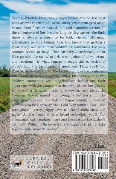 Sandra Whitten Plant has always looked around the next bend or over the next hill, occasionally getting snagged on an inconvenient fence or doused in a cold mountain stream. In the adventures of her decades-long writing career, she finds there is always a story to be told, whether affirming, informative or entertaining. She also knows that getting a good story out of a misadventure is sometimes the only comfort, lesson or hope. That curiosity-particularly about life's possibilities and what drives our points of view, actions and reactions-is what courses through this collection of stories (and the accompanying guidance). Thus, you'll find good at the heart of both the fiction and creative nonfiction tales found in Sweet Adversity. Enjoy Plant's account of two children contending with neighborhood bullies and their experience with the woman next door who shares her gloomy home with a departed husband. Likewise, read about the Vietnam War's impact on young sweethearts in the Tennessee hills and the belated happy ending of two old buddies who lived through that Cold War conflict. You'll also read about bigotry, puppy love, a beloved radio show and more. At the heart of this broad collection, you'll find encouragement, laughter, tears and the reasons the author's dad and William Shakespeare encourage us all to take lessons from Sweet Adversity. Sandra Whitten Plant has been writing articles and stories for many years. Her favorite creative writing form is the short story, a genre that requires keen observation and economy of words. She believes that each well-written short story is like a precious jewel. She has written articles for magazines and newspapers for many years. Her work of both fiction and nonfiction has been published in anthologies, but Sweet Adversity is her first book. She has taught creative writing in schools and workshops since 1975. For the past five years, she has led a workshop called Telling Your Story in a community-based program called Joy in Learning in Nashville, Tennessee. Sandra Whitten Plant was born in Birmingham, Alabama, in 1941, and moved with her family to Oak Ridge, Tennessee, at the age of nine. She studied at the University of Georgia and at the University of Tennessee. She has a B.S. degree in journalism. After a thirty-four-year career in public and community relations, she retired in 2007 from Bechtel National, Inc. She is a resident of Nashville, Tennessee.