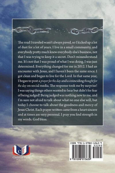 The road I traveled wasn't always paved, so I kicked up a lot of dust for a lot of years. I live in a small community, and everybody pretty much knew everybody else's business, not that I was trying to keep it a secret. Don't misunderstand me. It's not that I was proud of what I was doing. I was just determined. Everything changed for me in 2012. I had an encounter with Jesus, and I haven't been the same since. I got clean and began to live for the Lord. In that same year, I began to post a prayer for the day and a coinciding thought for the day on social media. The response took me by surprise! I was saying things others wanted to hear but didn't for fear of being judged! Being judged was nothing new to me, and I'm sure not afraid to talk about what no one else will, but today I choose to talk about the goodness and mercy of Jesus Christ. Each prayer written came from a heart sincere and at times are very personal. I pray you find strength in my words. God bless.