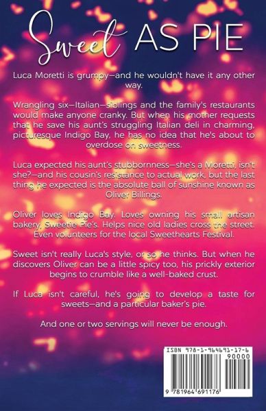 Luca Moretti is grumpy-and he wouldn't have it any other way. Wrangling six-Italian-siblings and the family's restaurants would make anyone cranky. But when his mother requests that he save his aunt's struggling Italian deli in charming, picturesque Indigo Bay, he has no idea that he's about to overdose on sweetness. Luca expected his aunt's stubbornness-she's a Moretti, isn't she?-and his cousin's resistance to actual work, but the last thing he expected is the absolute ball of sunshine known as Oliver Billings. Oliver loves Indigo Bay. Loves owning his small artisan bakery, Sweetie Pie's. Helps nice old ladies cross the street. Even volunteers for the local Sweethearts Festival. Sweet isn't really Luca's style, or so he thinks. But when he discovers Oliver can be a little spicy too, his prickly exterior begins to crumble like a well-baked crust. If Luca isn't careful, he's going to develop a taste for sweets-and a particular baker's pie. And one or two servings will never be enough.