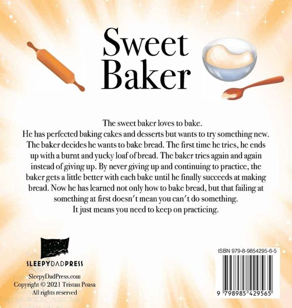The sweet baker loves to bake. He has perfected baking cakes and desserts but wants to try something new. The baker decides he wants to bake bread. The first time he tries, he ends up with a burnt and yucky loaf of bread. The baker tries again and again instead of giving up. By never giving up and continuing to practice, the baker gets a little better with each bake until he finally succeeds at making bread. Now he has learned not only how to bake bread, but that failing at something at first doesn't mean you can't do something. It just means you need to keep on practicing.