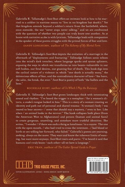 In this collection of poems, Gabriella R. Tallmadge strips away our soft exteriors and exposes the feral desires which escape from their cages when facing the possibility of death. Sweet Beast reflects a marriage wounded by the aftermath of a soldier's return from war, relating trauma in the only way it can be told: raw and with no embellishment. Tallmadge creates excruciating images onto the page, nurses them, and lets the poems bleed out. In cars kneading coyotes into asphalt, birds knifing through wind, and the torturous fear of death that transforms us into beasts, Tallmadge cuts to the bone to find love within the formidable survival instincts of our primitive self. Sweet Beast is a collection that is as rife with love as much as it is searing with fear, demanding the reader to pivot between the two.
