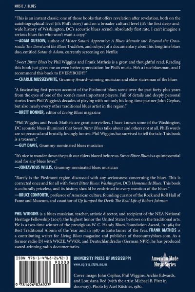 Sweet Bitter Blues: Washington, DC's Homemade Blues depicts the life and times of harmonica player Phil Wiggins and the unique, vibrant music scene around him, as described by music journalist Frank Matheis. Featuring Wiggins's story, but including information on many musicians, the volume presents an incomparable documentary of the African American blues scene in Washington, DC, from 1975 to the present. At its core, the DC-area acoustic "down home" blues scene was and is rooted in the African American community. A dedicated group of musicians saw it as their mission to carry on their respective Piedmont musical traditions: Mother Scott, Flora Molton, Chief Ellis, Archie Edwards, John Jackson, John Cephas, and foremost Phil Wiggins. Because of their love for the music and willingness to teach, these creators fostered a harmonious environment, mostly centered on Archie Edwards's famous barbershop where Edwards opened his doors every Saturday afternoon for jam sessions. Sweet Bitter Blues features biographies and supporting essays based on Wiggins's recollections and supplemented by Matheis's research, along with a foreword by noted blues scholar Elijah Wald, historic interviews by Dr. Barry Lee Pearson with John Cephas and Archie Edwards, and previously unpublished and rare photographs. This is the story of an acoustic blues scene that was and is a living tradition.