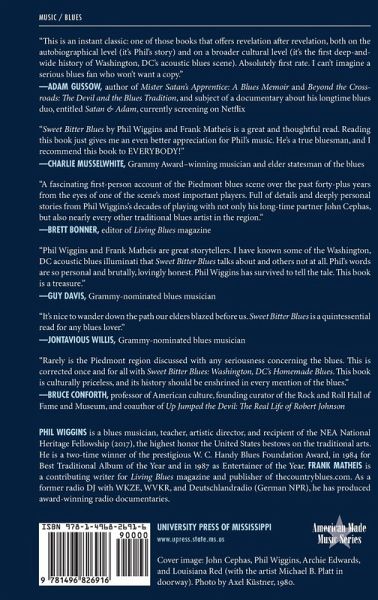 Sweet Bitter Blues: Washington, DC's Homemade Blues depicts the life and times of harmonica player Phil Wiggins and the unique, vibrant music scene around him, as described by music journalist Frank Matheis. Featuring Wiggins's story, but including information on many musicians, the volume presents an incomparable documentary of the African American blues scene in Washington, DC, from 1975 to the present. At its core, the DC-area acoustic "down home" blues scene was and is rooted in the African American community. A dedicated group of musicians saw it as their mission to carry on their respective Piedmont musical traditions: Mother Scott, Flora Molton, Chief Ellis, Archie Edwards, John Jackson, John Cephas, and foremost Phil Wiggins. Because of their love for the music and willingness to teach, these creators fostered a harmonious environment, mostly centered on Archie Edwards's famous barbershop where Edwards opened his doors every Saturday afternoon for jam sessions. Sweet Bitter Blues features biographies and supporting essays based on Wiggins's recollections and supplemented by Matheis's research, along with a foreword by noted blues scholar Elijah Wald, historic interviews by Dr. Barry Lee Pearson with John Cephas and Archie Edwards, and previously unpublished and rare photographs. This is the story of an acoustic blues scene that was and is a living tradition.