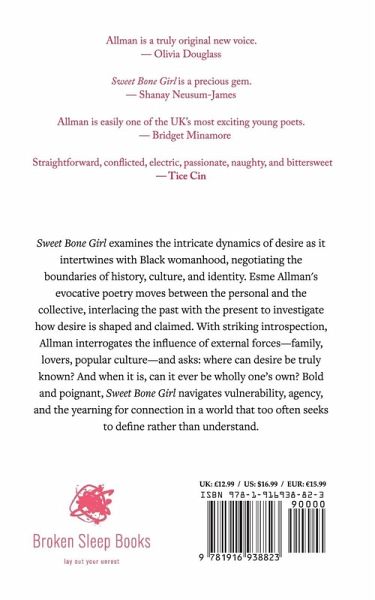 Sweet Bone Girl examines the intricate dynamics of desire as it intertwines with Black womanhood, negotiating the boundaries of history, culture, and identity. Esme Allman's evocative poetry moves between the personal and the collective, interlacing the past with the present to investigate how desire is shaped and claimed. With striking introspection, Allman interrogates the influence of external forces-family, lovers, popular culture-and asks: where can desire be truly known? And when it is, can it ever be wholly one's own? Bold and poignant, Sweet Bone Girl navigates vulnerability, agency, and the yearning for connection in a world that too often seeks to define rather than understand.