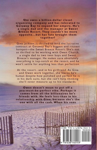 She owns a billion-dollar closet organizing company and has relocated to Getaway Bay to expand her empire. He's a single dad and the manager at Sweet Breeze Resort. They couldn't be more opposite...but has fate brought them together? Gina Jackson is thrilled to land the lucrative contract at Getaway Bay's biggest and ritziest hotspot-the Sweet Breeze Resort. She's not as thrilled to be working with Owen Church, a single dad to two teen boys and Sweet Breeze's manager. He makes sure absolutely everything is top-notch at the resort, and he won't settle for anything less than perfection. At the resort...and in his girlfriend. As Gina and Owen work together, she learns he's human despite how polished and perfect he is in his dark suits, but she can't help thinking she'll never measure up to his standards. Owen doesn't mean to put off a you-must-be-perfect vibe. Perhaps it comes from all the billionaires he's friends with. He feels less-than in his relationship with Gina, because she's the one with all the cash. When his sons make his work and personal life hard, will he be able to go to Gina as a soft place to fall? Or will their differences drive them apart?