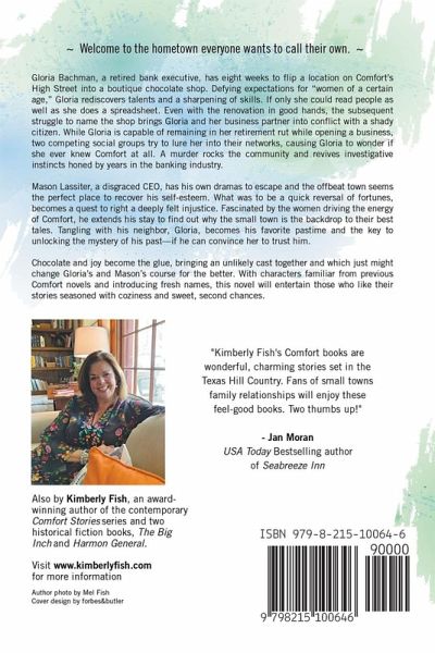 Gloria Bachman, a retired bank executive, has eight weeks to flip a location on Comfort's High Street into a boutique chocolate shop. Defying expectations for "women of a certain age," Gloria rediscovers talents and a sharpening of skills. If only she could read people as well as she does a spreadsheet. Even with the renovation in good hands, the subsequent struggle to name the shop brings Gloria and her business partner into conflict with a shady citizen. While Gloria is capable of remaining in her retirement rut while opening a business, two competing social groups try to lure her into their networks, causing Gloria to wonder if she ever knew Comfort at all. A murder rocks the community and revives investigative instincts honed by years in the banking industry. Mason Lassiter, a disgraced CEO, has his own dramas to escape and the offbeat town seems the perfect place to recover his self-esteem. What was to be a quick reversal of fortunes, becomes a quest to right a deeply felt injustice. Fascinated by the women driving the energy of Comfort, he extends his stay to find out why the small town is the backdrop to their best tales. Tangling with his neighbor, Gloria, becomes his favorite pastime and the key to unlocking the mystery of his past—if he can convince her to trust him. Chocolate and joy become the glue, bringing an unlikely cast together and which just might change Gloria's and Mason's course for the better. With characters familiar from previous Comfort novels and introducing fresh names, this novel will entertain those who like their stories seasoned with coziness and sweet, second chances. "Kimberly Fish's Comfort books are wonderful, charming stories set in the Texas Hill Country. Fans of small towns family relationships will enjoy these feel-good books. Two thumbs up!" - Jan Moran, USA Today Bestselling author of Seabreeze Inn.