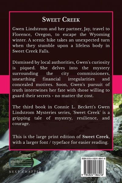 Gwen Lindstrom and her partner, Jay, travel to Florence, Oregon, to escape the Wyoming winter. A scenic hike takes an unexpected turn when they stumble upon a lifeless body in Sweet Creek Falls. Dismissed by local authorities, Gwen's curiosity is piqued. She delves into the mystery surrounding the city commissioners, unearthing financial irregularities and concealed motives. Soon, Gwen's pursuit of truth intertwines her fate with those willing to guard their secrets - no matter the cost. The third book in Connie L. Beckett's Gwen Lindstrom Mysteries series, 'Sweet Creek' is a gripping tale of mystery, resilience, and courage. This is the large print edition of Sweet Creek, with a larger font / typeface for easier reading.