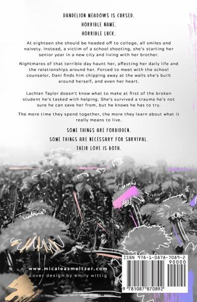 Dandelion Meadows is cursed. Horrible name. Horrible luck. At eighteen she should be headed off to college, all smiles and naivety. Instead, a victim of a school shooting, she's starting her senior year in a new city and living with her brother. Nightmares of that terrible day haunt her, affecting her daily life and the relationships around her. Forced to meet with the school counselor, Dani finds him chipping away at the walls she's built around herself, and even her heart. Lachlan Taylor doesn't know what to make at first of the broken student he's tasked with helping. She's survived a trauma he's not sure he can save her from, but he knows he has to try. The more time they spend together, the more they learn about what it really means to live. Some things are forbidden. Some things are necessary for survival. Their love is both.