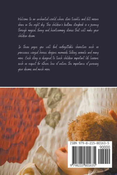 Welcome to an enchanted world where stars twinkle and full moons shine in the night sky. This children's bedtime storybook is a journey through magical, funny and heartwarming stories that will make your children dream. In these pages, you will find unforgettable characters such as princesses, winged horses, dragons, mermaids, talking animals and many more. Each story is designed to teach children important life lessons, such as respect for others, love of nature, the importance of pursuing your dreams, and much more.