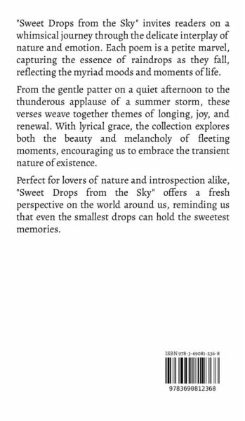 "Sweet Drops from the Sky" invites readers on a whimsical journey through the delicate interplay of nature and emotion. Each poem is a petite marvel, capturing the essence of raindrops as they fall, reflecting the myriad moods and moments of life. From the gentle patter on a quiet afternoon to the thunderous applause of a summer storm, these verses weave together themes of longing, joy, and renewal. With lyrical grace, the collection explores both the beauty and melancholy of fleeting moments, encouraging us to embrace the transient nature of existence. Perfect for lovers of nature and introspection alike, "Sweet Drops from the Sky" offers a fresh perspective on the world around us, reminding us that even the smallest drops can hold the sweetest memories.