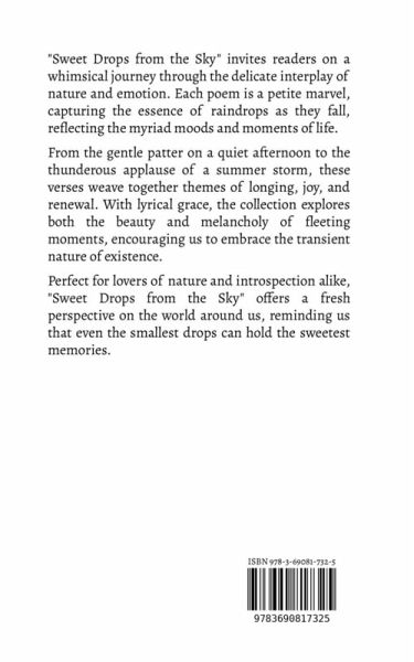"Sweet Drops from the Sky" invites readers on a whimsical journey through the delicate interplay of nature and emotion. Each poem is a petite marvel, capturing the essence of raindrops as they fall, reflecting the myriad moods and moments of life. From the gentle patter on a quiet afternoon to the thunderous applause of a summer storm, these verses weave together themes of longing, joy, and renewal. With lyrical grace, the collection explores both the beauty and melancholy of fleeting moments, encouraging us to embrace the transient nature of existence. Perfect for lovers of nature and introspection alike, "Sweet Drops from the Sky" offers a fresh perspective on the world around us, reminding us that even the smallest drops can hold the sweetest memories.