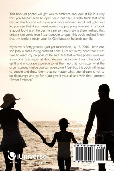 This book of poetry will get you to embrace and look at life in a way that you haven't seen to open your inner self. I really think that after reading this book it will make you more motived and it will uplift and let you see that if you want something just press forward. This book is about looking at the best in a person and making them realized that dreams can come true. I want people to open this book and just know that the battle is never your it's God because he leads our life.