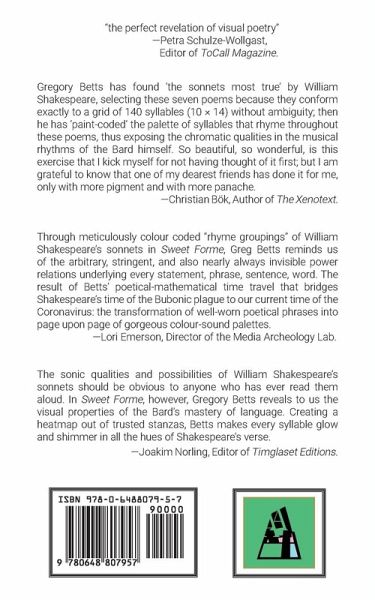 Shakespeare built his famous sonnets by a unique sound pattern of rhymes in the final syllable, the tenth column, of each line. What was he doing in the rest of the sonnet? Sweet Forme: Shake-Speare's Perfect Sonnets is part of a broader BardCode project that maps out the full sound pattern of rhymes in all ten columns across all of Shakespeare's sonnets. Colour coding these sound-codes results in a visual text rich with the sonic patterns of the poems. Suddenly, for the first time, you can see the BardCode. Sweet Forme presents seven visualizations of this hidden BardCode in this second edition full-colour, softcover version. Following the Bard's own scheme, Sweet Forme reveals the complete rhymes for the very first time. Compiled and with an introduction by Gregory Betts. From the Introduction: What does the dominance of maths, however unseen, mean for art, culture, self, perspective, and time? Long before it became dominant, there was Shakespeare using the grid as medium to delve into these same questions. In 1609, he published a series of 154 sonnets called Shake-Speare's Sonnets. Now, from our vantage in the grid, we can recognize the sonnet as a poetics of math, the embodiment of the desire to define arbitrary frames and work within such limitations to reveal the buried structure of the world. These are poems that hold poetry up as vaccine to omnipresent ailment and decay. I invite you now, dear reader, to consider these timeless monuments to abstraction, the only perfect sonnets in Shakespeare's oeuvre, as anticipations and revelations of the meaning of the grid. Sweet Forme collects these perfect sonnets in this new full-colour softcover second edition.