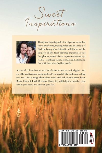 Through an inspiring collection of poetry, the author shares comforting, inviting reflections on the love of God, the beauty of a relationship with Christ, and the little joys in life. From cherished memories to wise thoughts to ponder, Sweet Inspirations encourages readers to embrace the joy, wonder, and celebration that a life lived with God has to offer. All my life, I have been in and out of various churches and religions. As I got older and became a single mother, I've always felt like God was watching over me. I felt strongly about these words and had to write them down. Before I knew it I had 52 poems. I hope they will brighten your day, place love in your heart, or a smile on your face.