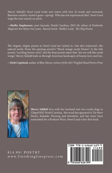Sherry Siddall's Sweet Land rocks and waves with love of words and surround. Bareness crackles, winter's gone-spring! Who has not experienced this! Sweet Land sings the tune exactly on pitch. -Shelby Stephenson, poet laureate, North Carolina, 2015-18, editor of Pembroke Magazine for thirty-two years. Recent book: Shelby's Lady: The Hog Poems. The elegant, elegiac poems in Sweet Land are rooted in-but also transcend-the natural world. From the opening sonnet's "Mock orange newly blown," to the title poem's "scrolling brown river," and the final poem's ashes that "are not soft like moth wings," Sherry Siddall leads us through American landscapes of beauty, love, and loss. -Beth Copeland, author of Blue Honey, winner of the 2017 Dogfish Head Poetry Prize