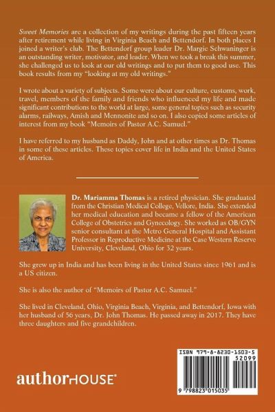 Sweet Memories are a collection of my writings during the past fifteen years after retirement while living in Virginia Beach and Bettendorf. In both places I joined a writer's club. The Bettendorf group leader Dr. Margie Schwaninger is an outstanding writer, motivator, and leader. When we took a break this summer, she challenged us to look at our old writings and to put them to good use. This book results from my "looking at my old writings." I wrote about a variety of subjects. Some were about our culture, customs, work, travel, members of the family and friends who influenced my life and made significant contributions to the world at large, some general topics such as security alarms, railways, Amish and Mennonite and so on. I also copied some articles of interest from my book "Memoirs of Pastor A.C. Samuel." I have referred to my husband as Daddy, John and at other times as Dr. Thomas in some of these articles. These topics cover life in India and the United States of America.