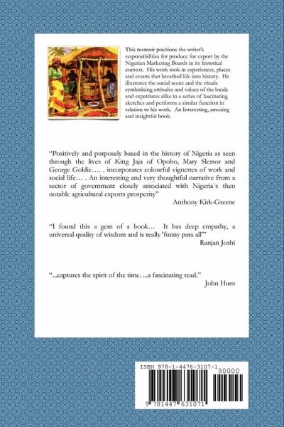 This memoir positions the writer's responsibilities for produce for export by the Nigerian Marketing Boards in its historical context. His work took in experiences, places and events that breathed life into history. He illustrates the social scene and the rituals symbolising attitudes and values of the locals and expatriates alike in a series of fascinating vignettes and performs a similar function in relation to his work. An Interesting, amusing and insightful book.