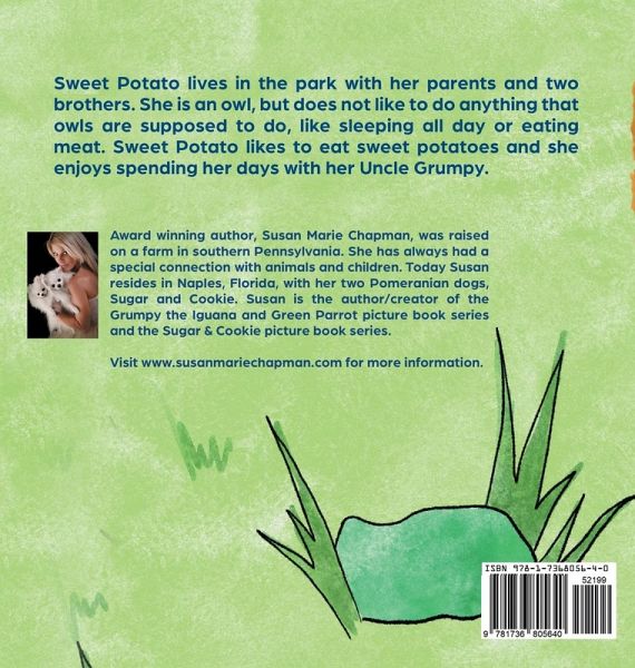 Sweet Potato lives in the park with her parents and two brothers. She is an owl, but does not like to do anything owls are supposed to do, like sleeping all day or eating meat. Sweet Potato likes to eat sweet potatoes and she enjoys spending her days with her Uncle Grumpy.