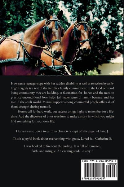 Tragedy strikes a loving family, but they are not overcome. The Reddick family will build its dream of a special land development. Jesi will be brave and determined enough to fulfill her dream of competing her driving horses at the Advanced level. Her brother, JT is the wild one in the family with his self-centered ways. He plans to take over the family business by deception. Can Jack and Jesi find the grace to do what must be done while still loving in a way that will heal a broken family? Paul finds himself in the middle and is glad to be there. After their marriage, Jesi and Paul honeymoon with their horses in the Sierra Nevada mountains of California where hair-raising adventure finds them.