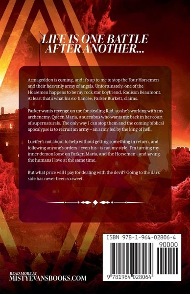 Life is one battle after another... Armageddon is coming, and it's up to me to stop the Four Horsemen and their heavenly army of angels. Unfortunately, one of the Horsemen happens to be my rock star boyfriend, Radison Beaumont. At least that's what his ex-fiancée, Parker Burkett, claims. Parker wants revenge on me for stealing Rad, and she's working with my archenemy, Queen Maria, a succubus who wants me back in her court of supernaturals. The only way I can stop them and the coming biblical apocalypse is to recruit an army - an army led by the king of hell. Lucifer's not about to help without getting something in return, and following anyone's orders - even his - is not my style. I'm turning my inner demon loose on Parker, Maria, and the Horsemen - and saving the humans I love at the same time. But what price will I pay for dealing with the devil? Going to the dark side has never been so sweet.