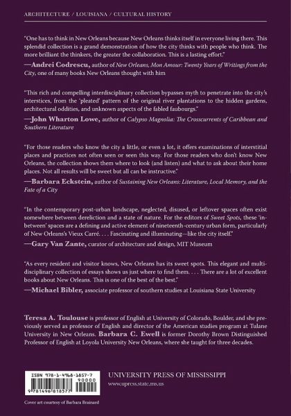 Contributions by Carrie Bernhard, Scott Bernhard, Marilyn R. Brown, Richard Campanella, John P. Clark, Joel Dinerstein, Pableaux Johnson, John P. Klingman, Angel Adams Parham, Bruce Boyd Raeburn, Ruth Salvaggio, Christopher Schaberg, Teresa A. Toulouse, and Beth Willinger Much has been written about New Orleans's distinctive architecture and urban fabric, as well as the city's art, literature, and music. There is, however, little discussion connecting these features. Sweet Spots--a title drawn from jazz musicians' name for the space "in-between" performers and dancers where music best resonates--provides multiple connections between the city's spaces, its complex culture, and its future. Drawing on the late Tulane architect Malcolm Heard's ideas about "interstitial" spaces, this collection examines how a variety of literal and represented "in-between" spaces in New Orleans have addressed race, class, gender, community, and environment. As scholars of architecture, art, African American studies, English, history, jazz, philosophy, and sociology, the authors incorporate materials from architectural history and practice, literary texts, paintings, drawings, music, dance, and even statistical analyses. Interstitial space refers not only to functional elements inside and outside of many New Orleans houses--high ceilings, hidden staircases, galleries, and courtyards--but also to compelling spatial relations between the city's houses, streets, and neighborhoods. Rich with visual materials, Sweet Spots reveals the ways that diverse New Orleans spaces take on meanings and accrete stories that promote certain consequences both for those who live in them and for those who read such stories. The volume evokes, preserves, criticizes, and amends understanding of a powerful and often-missed feature of New Orleans's elusive reality.