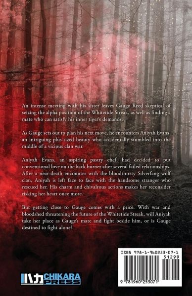 An intense meeting with his sister leaves Gauge Reed skeptical of seizing the alpha position of the Whitetide Streak, as well as finding a mate who can satisfy his inner tiger's demands. As Gauge sets out to plan his next move, he encounters Aniyah Evans, an intriguing plus-sized beauty who accidentally stumbled into the middle of a vicious clan war. Aniyah Evans, an aspiring pastry chef, had decided to put conventional love on the back burner after several failed relationships. After a near-death encounter with the bloodthirsty Silverfang wolf clan, Aniyah is left face to face with the handsome stranger who rescued her. His charm and chivalrous actions makes her reconsider risking her heart once more. But getting close to Gauge comes with a price. With war and bloodshed threatening the future of the Whitetide Streak, will Aniyah take her place as Gauge's mate and fight beside him, or is Gauge destined to fight alone?