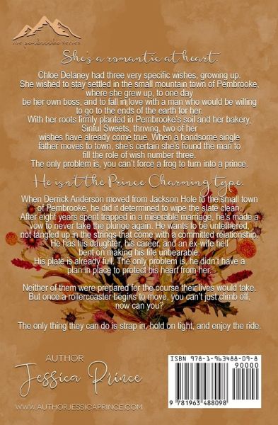 She's a romantic at heart. Chloe Delaney had three very specific wishes, growing up. She wished to stay settled in the small mountian town of Pembrooke, where she grew up, to one day be her own boss, and to fall in love with a man who is willing to go to the ends of the earth for her. With her roots firmly planted in Pembrooke's soil and her bakery, Sinful Sweets, thriving, two of her wishes have already come true. When a handsome single father moves to town, she's certain she's found the man to fill the role of wish number three. The only problem is, you can't force a frog to turn into a Prince. He isn't the Prince charming type. When Derrick Anderson moved from Jackson Hole to the small town of Pembrooke, he did it determined to wipe the slate clean. After 8 years trapped in a miserable marraige, he's made a vow to never take the plunge again. He wants to be untethered, not tangled up in the strings, that come with a committed relationship. He has his daughter, his career, and an ex-wife hell bent on making his life unbearable. His plate is already full. The only problem is, he didn't have a plan in place to protect his heart from her. Neither of them were prepared for the course their lives would take. But once a rollercoaster begins to move, you can't just climb off, now can you? The only thing they can do is strap in, hold on tight, and enjoy the ride.