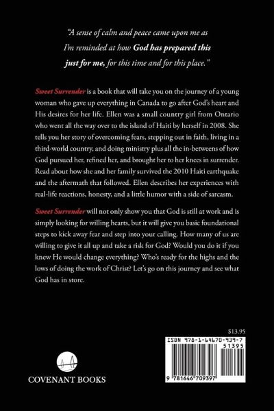 Sweet Surrender is a book that will take you on the journey of a young woman who gave up everything in Canada to go after God’s heart and His desires for her life. Ellen was a small country girl from Ontario who went all the way over to the island of Haiti by herself in 2008. She tells you her story of overcoming fears, stepping out in faith, living in a third-world country, and doing ministry plus all the in-betweens of how God pursued her, refined her, and brought her to her knees in surrender. Read about how she and her family survived the 2010 Haiti earthquake and the aftermath that followed. Ellen describes her experiences with real-life reactions, honesty, and a little humor with a side of sarcasm. Sweet Surrender will not only show you that God is still at work and is simply looking for willing hearts, but it will give you basic foundational steps to kick away fear and step into your calling. How many of us are willing to give it all up and take a risk for God? Would you do it if you knew He would change everything? Who’s ready for the highs and the lows of doing the work of Christ? Let’s go on this journey and see what God has in store.