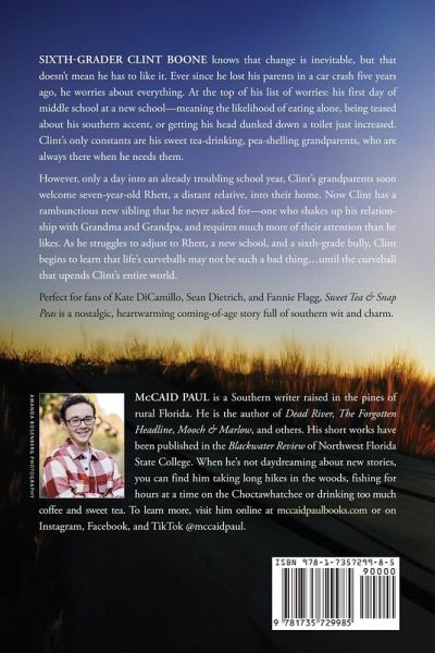 Perfect for fans of Kate DiCamillo, Sean Dietrich, and Fannie Flagg, Sweet Tea & Snap Peas is a nostalgic, heartwarming family story full of southern wit and charm. ¿¿Sixth-grader Clint Boone knows that change is inevitable, but that doesn't mean he has to like it. Ever since he lost his parents in a car crash five years ago, he worries about everything. At the top of his list of worries: his first day of middle school at a new school-meaning the likelihood of eating alone, being teased about his southern accent, or getting his head dunked down a toilet just increased. Clint's only constants are his sweet tea-drinking, pea-shelling grandparents, who are always there when he needs them. However, only a day into an already troubling school year, Clint's grandparents soon welcome seven-year-old Rhett, a distant relative, into their home. Now Clint has a rambunctious new sibling that he never asked for-one who shakes up his relationship with Grandma and Grandpa, and requires much more of their attention than he likes. As he struggles to adjust to Rhett, a new school, and a sixth-grade bully, Clint begins to learn that life's curveballs may not be such a bad thing...until the curveball that upends Clint's entire world.