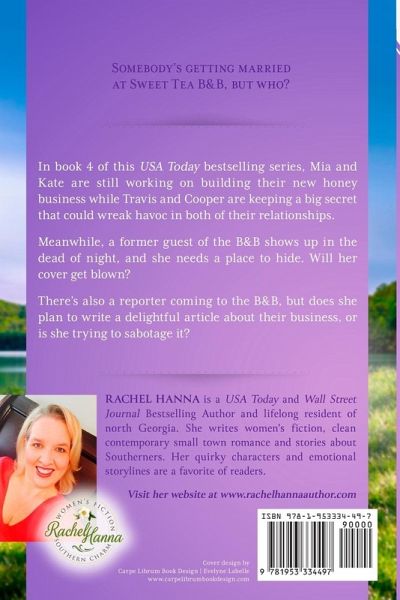 Somebody is getting married at Sweet Tea B&B! In book 4 of this USA Today bestselling series. Mia and Kate are still working on building their new honey business while Travis and Cooper are keeping a big secret that could wreak havoc in both of their relationships. Meanwhile, a former guest of the B&B shows up in the dead of night, and she needs a place to hide. Will her cover get blown? There's also a reporter coming to the B&B, but does she plan to write a nice piece about their business, or is she trying to sabotage it?