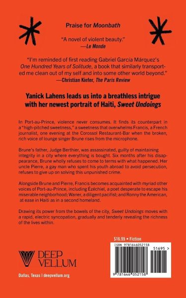 Yanick Lahens leads us into a breathless intrigue with her newest portrait of Haiti, Sweet Undoings. In Port-au-Prince, violence never consumes. It finds its counterpart in a "high-pitched sweetness", a sweetness that overwhelms Francis, a French journalist, one evening at the Corossol Restaurant-Bar, when the broken, rich voice of lounge singer Brune rises from the microphone. Brune's father, Judge Berthier, was assassinated, guilty of maintaining integrity in a city where everything is bought. Six months after this disappearance, Brune wholly refuses to come to terms with what happened. Her uncle Pierre, a gay man who spent his youth abroad to avoid persecution, refuses to give up on solving this unpunished crime. Alongside Brune and Pierre, Francis becomes acquainted with myriad other voices of Port-au-Prince, including Ézèchiel, a poet desperate to escape his miserable neighborhood; Waner, a diligent pacifist; and Ronny the American, at ease in Haiti as in a second homeland. Drawing its power from the bowels of the city, Sweet Undoings moves with a rapid, electric syncopation, gradually and tenderly revealing the richness of the lives within.