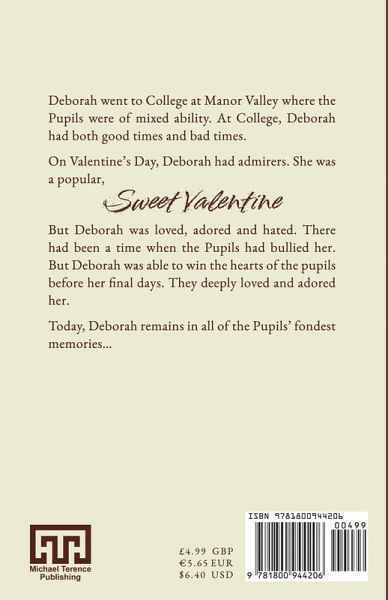 Deborah went to College at Manor Valley where the Pupils were of mixed ability. At College, Deborah had both good times and bad times. On Valentine's Day, Deborah had admirers. She was a popular, Sweet Valentine. But Deborah was loved, adored and hated. There had been a time when the Pupils had bullied her. But Deborah was able to win the hearts of the pupils before her final days. They deeply loved and adored her. Today, Deborah remains in all of the Pupils' fondest memories...