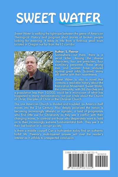 Fleenor's new novel, Sweet Water, is walking the tightrope between the genre of American Theological History and poignant short stories of broken people looking for meaning. It takes its title from a fictitious small town in Oregon, not far from the I-5 corridor. Somewhere out there, there is a serial killer. The diverse characters are strong men and women, enduring against great odds. Scarred, they still seethe with their frayed emotions. Sweet Water is a readable story of an archetypical American Church known as the Restoration Movement. This one American Church is divided and troubled. It reflects our polarized America. In this land of pragmatist, some atheist and agnostics find little use for Christianity, since they see it in conflict with their changing mores. In contrast, other Americans hold on desperately to an increasingly extreme fundamentalist faith. Is there a middle course? Can a truth-seeker find an authentic faith? Mr. Fleenor's multi-layered answer will rivet the readers' interest.