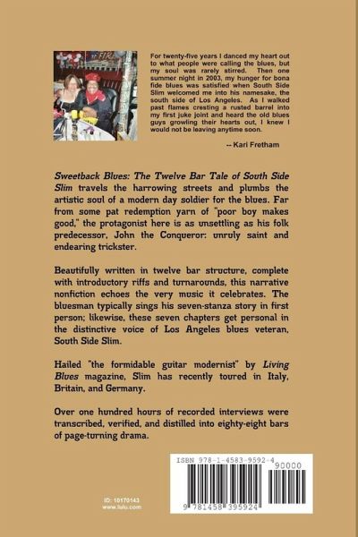 Sweetback Blues: The Twelve Bar Tale of South Side Slim travels the harrowing streets and plumbs the artistic soul of a modern day soldier for the blues. Far from some pat redemption yarn of "poor boy makes good," the protagonist here is as unsettling as his folk predecessor, John the Conqueror: unruly saint and endearing trickster. Beautifully written in twelve bar structure, complete with introductory riffs and turnarounds, this narrative nonfiction echoes the very music it celebrates. The bluesman typically sings his seven-stanza story in first person; likewise, these seven chapters get personal in the distinctive voice of Los Angeles blues veteran, South Side Slim. Hailed "the formidable guitar modernist" by Living Blues magazine, Slim has recently toured in Italy, Britain, and Germany. Over one hundred hours of recorded interviews were transcribed, verified, and distilled into eighty-eight bars (vignettes) of page-turning drama.