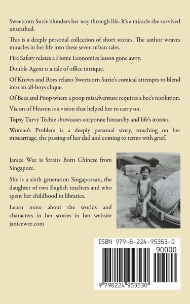 Sweetcorn Suzie blunders her way through life. It's a miracle she survived unscathed. This is a deeply personal collection of short stories. The author weaves miracles in her life into these seven urban tales. Fire Safety relates a Home Economics lesson gone awry. Double Agent is a tale of office intrique. Of Knives and Boys relates Sweetcorn Suzie's comical attempts to blend into an all-boys clique. Of Bees and Poop where a poop misadventure requires a bee's resolution. Vision of Heaven is a vision that helped her to carry on. Topsy Turvy Techie showcases corporate hierarchy and life's ironies. Woman's Problem is a deeply personal story, touching on her miscarriage, the passing of her dad and coming to terms with grief.