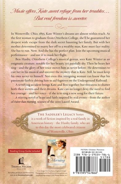 Ben's talent and Kate's sweet voice make them the perfect match-but Kate's mother is determined to keep them apart. In 1854, the winds of change blow through Ohio, where free state borders slave state. By day, Ben Hanby is a talented musician who directs musicals for his Westerville college. By night, he secretly aids fugitives on the Underground Railroad. When Ben casts lovely Kate Winter to sing in his latest show, they find they share a love for music and ideas. But Kate's mother wants her daughter to marry a rich man. Ben has given his life to God, not to the pursuit of wealth. Kate Winter will be the first female graduate of Otterbein College, and every young man in town courts her. But Kate's dark family secrets leave her unspeakably shy. When Kate joins the Hanbys in their dangerous work on the Underground Railroad, she finds her courage and her voice. Can Ben and Kate find a way to be together in spite of the obstacle of Kate's family?